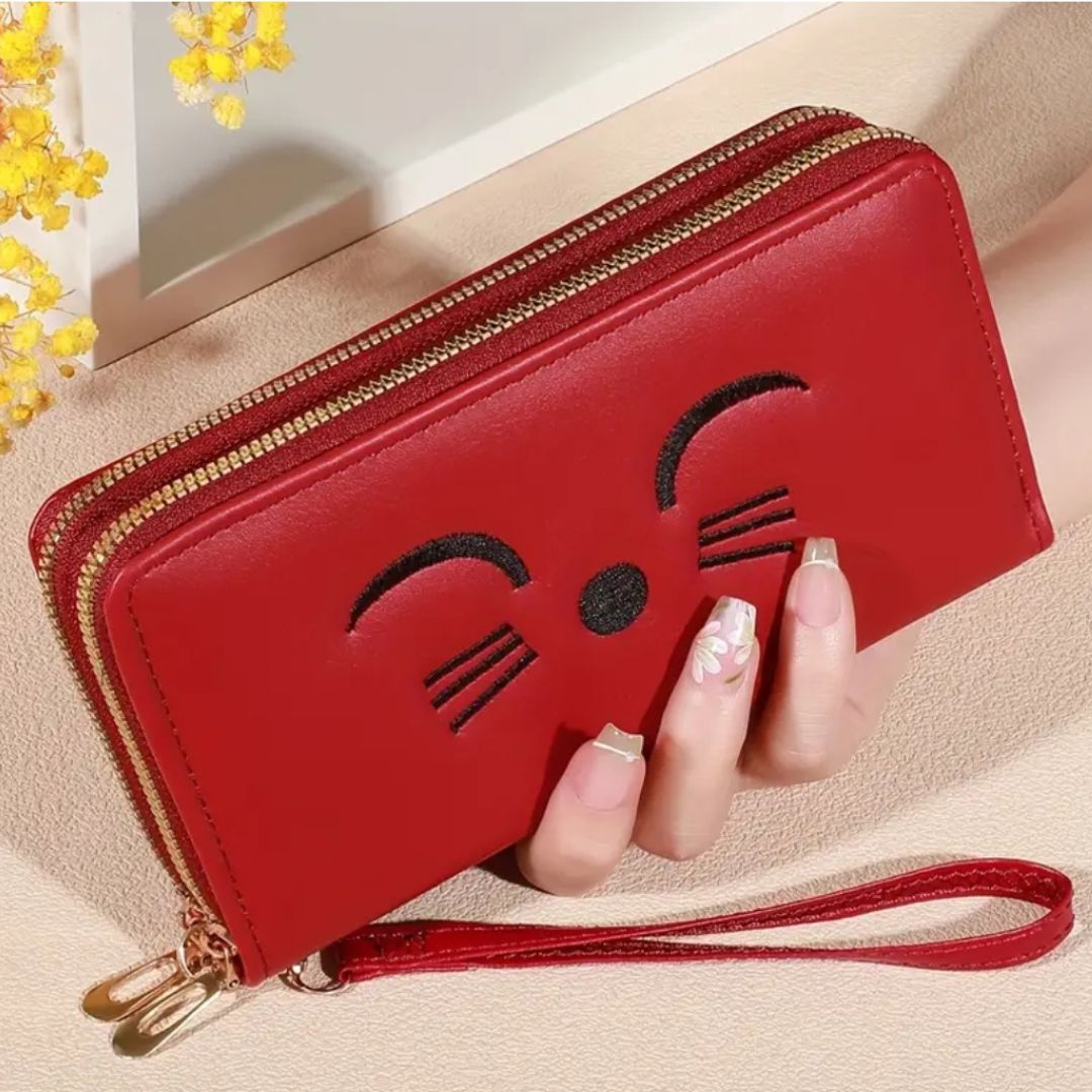 Billetera con diseño de gato material imitacion cuero con cremallera, diseño tejido con bigotes. ideal para llevar efectivo, tarjetas